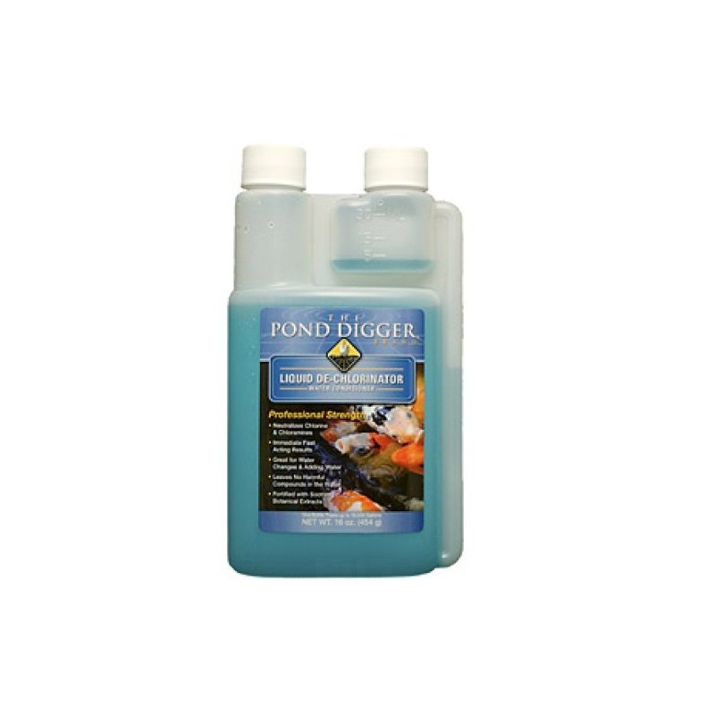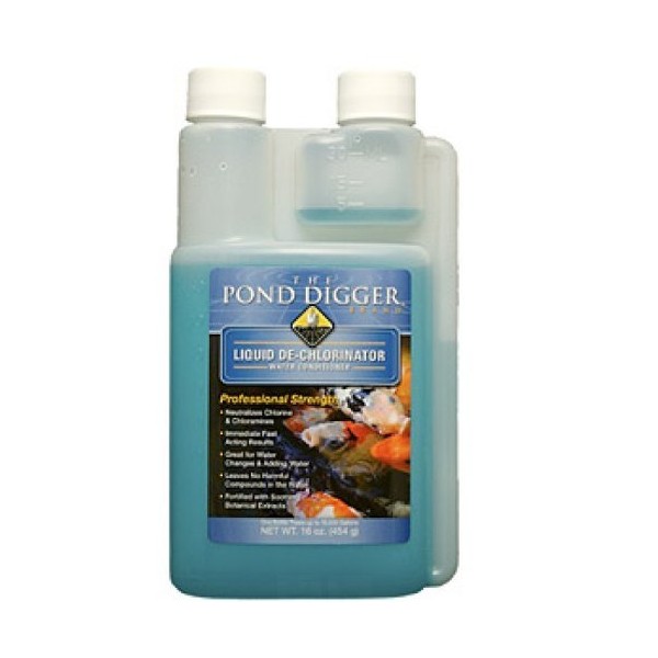 The Pond Digger Liquid De-Chlorinator not only neutralizes harmful chlorine and chloramine levels in your pond, but also protects pond inhabitants from harmful and insoluble elements common in tap water. Better yet, it contains naturally soothing botanical extracts to help fish adjust in times of increased stress (which otherwise can increase risk of fish disease) while also creating a water environment safe for fish, turtles, tadpoles and aquatic plants. Using Helix Brand De-Chlorinator will render your municipal tap water safe to your fish and will protect them from chlorine exposure and heavy metal toxicity, whether in a brand new or long-established pond. Keep on hand, as the ability to make your tap water safe is indispensable in case of routine or emergency water changes or transit. Since this product is intended only to remove harmful elements from water, ensure that there is adequate biological filtration and/or remember to follow application with a beneficial bacteria treatment, in order to provide optimal nutrient absorption.