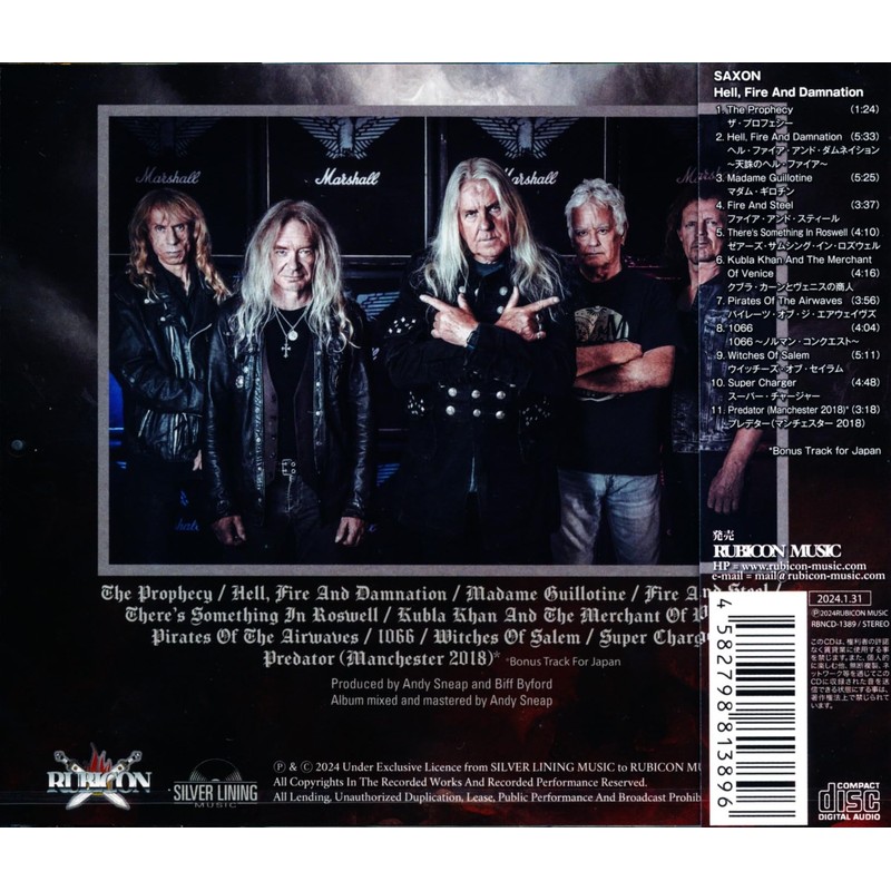 前作同様、プロデュースにはアンディ・スニープ(JUDAS PRIEST他)がビフとともに担当している。今作は、前作の後オリジナルメンバーとしてビフとともに長年SAXONを支えてきたポール・クイン(g)がツアーからの引退を発表し、後任には同じ時代を生きた同胞DIAMOND HEADのブライアン・タトラー(g)が参加しているのが大きな違いだ。そのブライアンはアルバム作曲にも参加し、アグレシヴな血をバンドにもたらしている!他のメンバーは不動のナイジェル・グロックラー(dr)、ニブス・カーター(b)、ダグ・スカーラット(g)。ブライアンが参加し、MVにもなっているアルバム・タイトルソングは善と悪の戦いについてのビフの熱い思いが詰まった劇的なメタル・ナンバーだが、実際はタイトルの”Hell, Fire and Damnation”とはビフの父親の昔からの口癖から来ていて、幼いころのビフが悪戯をすると父親が『何やってる!?地獄に墜ちろ、火炙り、破滅だ!』と怒るというのがお決まりだったとの事。