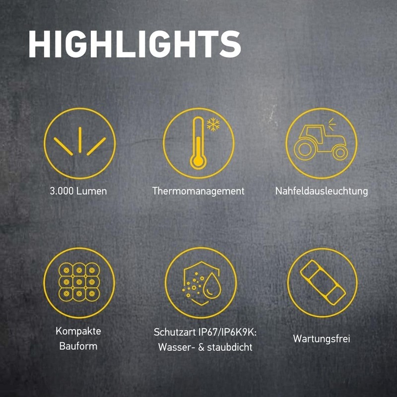 • The LED work lights are also completely maintenance-free and offer a significantly longer service life than the bulb of a halogen headlight.