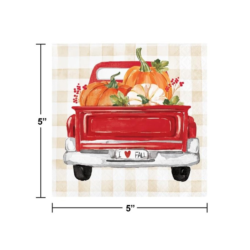 - Fall Harvest Themed Design: Celebrates harvest time with orange and white pumpkins in the bed of a red farm pickup truck with an "I Fall" license plate.