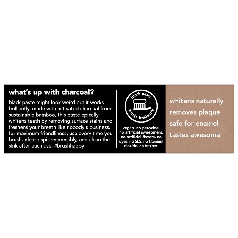 welcome to the dark side of the tube. black, white, and friendly all over. a friendly force of nature. ok, well stop. weve got a million puns about black toothpaste, but were serious about how awesome it is to brush with our fluoride free activated charcoal toothpaste. our activated charcoal toothpaste whitens naturally and gently without peroxide, and is safe for every day use. beyond whitening teeth activated charcoal toothpaste kicks plaque to the curb, and takes care of your mouth with coconut oil and your breath with fresh mint, spearmint, and peppermint. oh, and in case you missed it, the paste is black. a friendly word of caution: black paste can get a little messy if youre not mindful. please remember to spit responsibly, clean your sink, and make your mamma proud. hello charcoal teeth whitening toothpaste is fluoride free, vegan, and free from, SLS/sulfates, artificial sweeteners/flavors, parabens, microbeads, triclosan, and gluten. like all of our pastes, its with globally sourced ingredients in BPA-free tubes, and of course, we never test on animals-that would be insanely unfriendly (leaping bunny certified and peta recognized). brush happy.