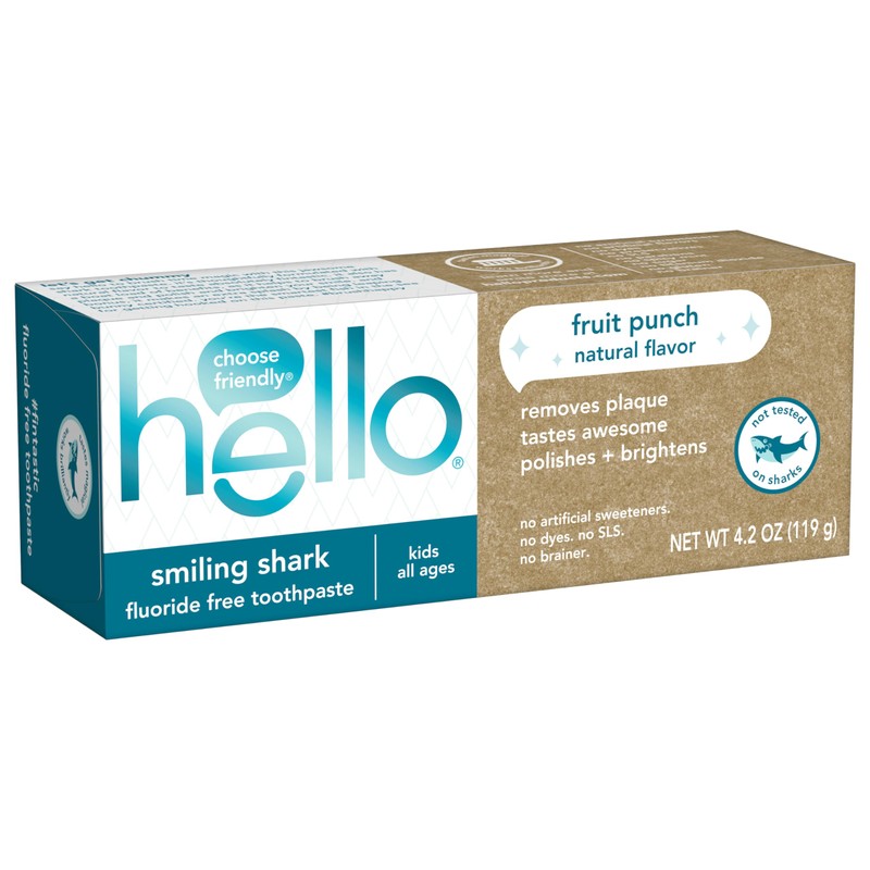 - WHAT I'M GETTING: Includes one (1) 4.2 oz tube of hello Smiling Shark Fluoride Free Kids Toothpaste, Natural Fruit Punch flavored