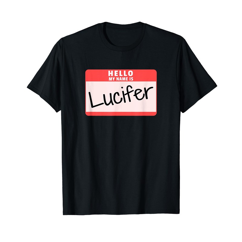 - Funny name tag of the Devil Lucifer is a great simple halloween costume t-shirt that goes with any devilish accessories. Great for people with no costumes or simply don't like wearing big costumes. Wear a halloween t-shirt instead so you won't get too swea