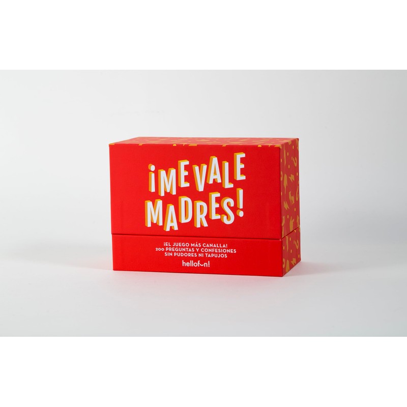 hellofun Me vale madres el juego más perverso 200 tarjetas con preguntas y confesiones sin pudores ni tapujos, 1 dado y 1 tarjeta con instrucciones. Un juego con 200 preguntas y confesiones sin pudores ni tapujos. ¡El juego más original para echar el relajo con amigos y descubrir toda la verdad sobre ellos! ¿Se animan? Cuatro categorías diferentes: "Confiesa", "¿Qué harías si...?", "¿Qué preferirías...?" y "¿Quién de nosotros...?" Este juego no se anda con rodeos, así que... ¡a responder sin pena ni vergüenza! ¡Prepárense, porque sus secretos más profundos están a punto de salir a la luz! Encontrarán preguntas como "Confiesa... ¿Alguna vez te has tomado una foto subida de tono?", "¿Qué harías si tuvieras que seducir a la persona a tu derecha?", "¿Qué preferirías, mandarle por error una foto desnudo/a a tu jefe o a tus padres?" o "¿Quién de nosotros es más probable que llegue borracho al trabajo?". Me vale madres es un juego que simplemente no podrán dejar de jugar. Se convertirá en tu mejor aliado y no podrá faltar en ninguna reunión o fiesta más. Y, recuerden, ¡a responder sin miedo con este regalo original!