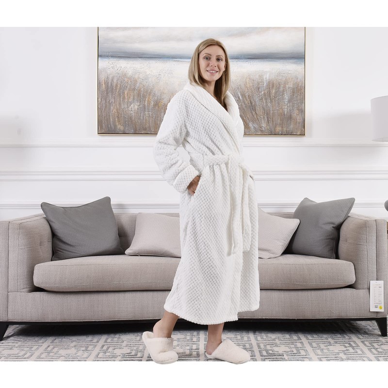 Hellomamma Womens Long Robe Soft Warm Fleece Plush Bathrobe Ladies Sleepwear Pajamas Housecoat Nightgown White Large-X-Large