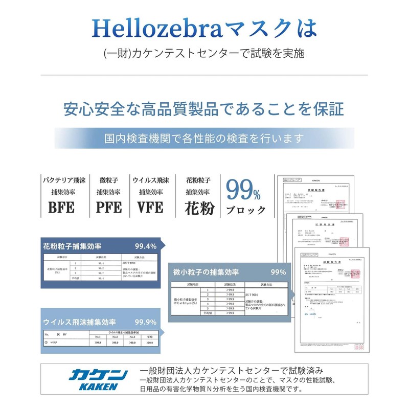 - 【日本国内検品】日本権威的な検定機関KAKENのカケンテストをクリアし、BFE・VFE・PFE・花粉のろ過効率は99.4%以上!更に、3D立体裁断技術を採用し、マスクが顔にピッタリ密着して、空隙なく細菌やウイルスの侵入を防止します