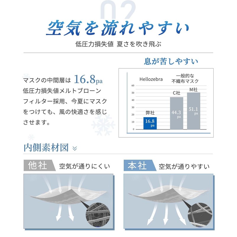 - 【耳が痛くならない 】 幅6㎜の平ゴム耳ひもを採用し、お肌に優しい素材を使用して、長時間の着用でも痛くなりにくく、超音波溶着技術でひもとマスクをしっかり接着し、切れにくくなっています。