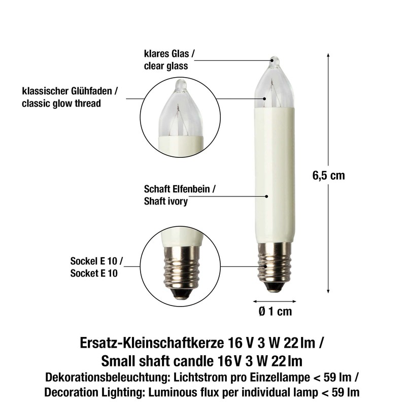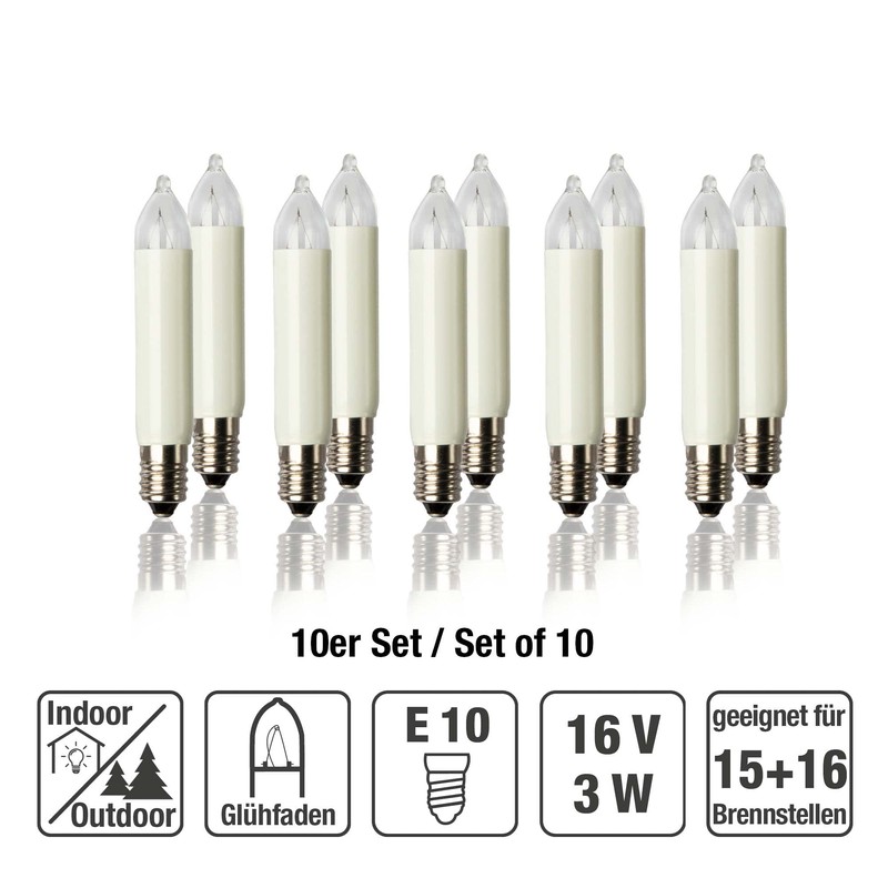 Hellum 934014 Replacement Bulbs for Arch, Pack of 10, 16V 3W Small Shaft Candles for Arch, Replacement Candles, Indoor Outdoor Fairy Lights, 10 Burning Points, Diameter 10 mm E10, 16V, 3W, 22 Lumen