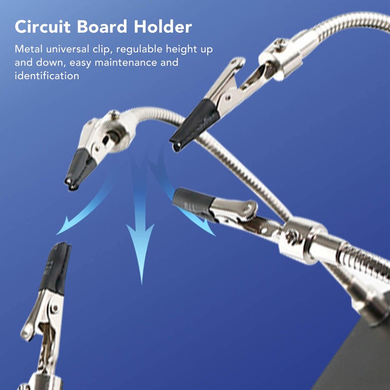 • 【ADJUSTABLE FLEXIBLE UNIVERSAL ARMS】Four small flexible gooseneck helping hands are easily positioned where you want them , which allows you to adjust the clamping angle 360 degrees at will. Eliminates the frustration of traditional helping hands, ideal for soldering, circuit board holder, assembly, repair, modeling, hobby, jewelry, electronics, arts, crafts.
