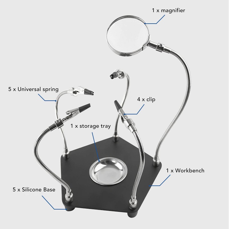 • 【SOLDERING HELPING HANDS】The soldering magnifier holder is equipped with multiple clips, which can flexibly clamp various items, with storage tray design, which can place small parts and items. An adjustable metal gooseneck arm with a 3X magnifier helps you see details or tiny things, improving work and efficiency, and freeing your eyes from fatigue.