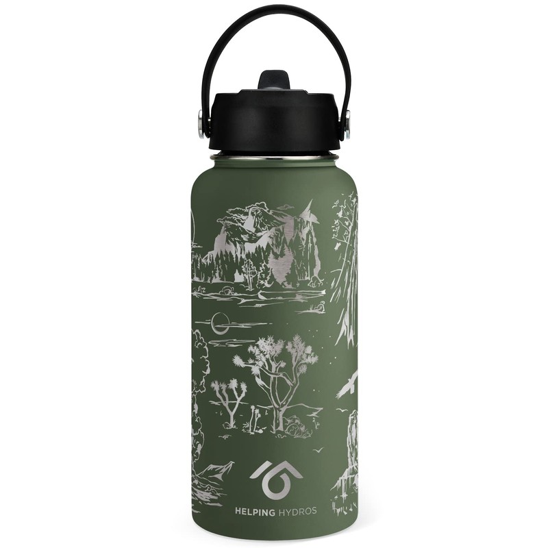 Helping Hydros National Parks - Botella de agua con tapa de popote, 32 onzas de acero inoxidable grabado aislado con correa, temática de parques nacionales
