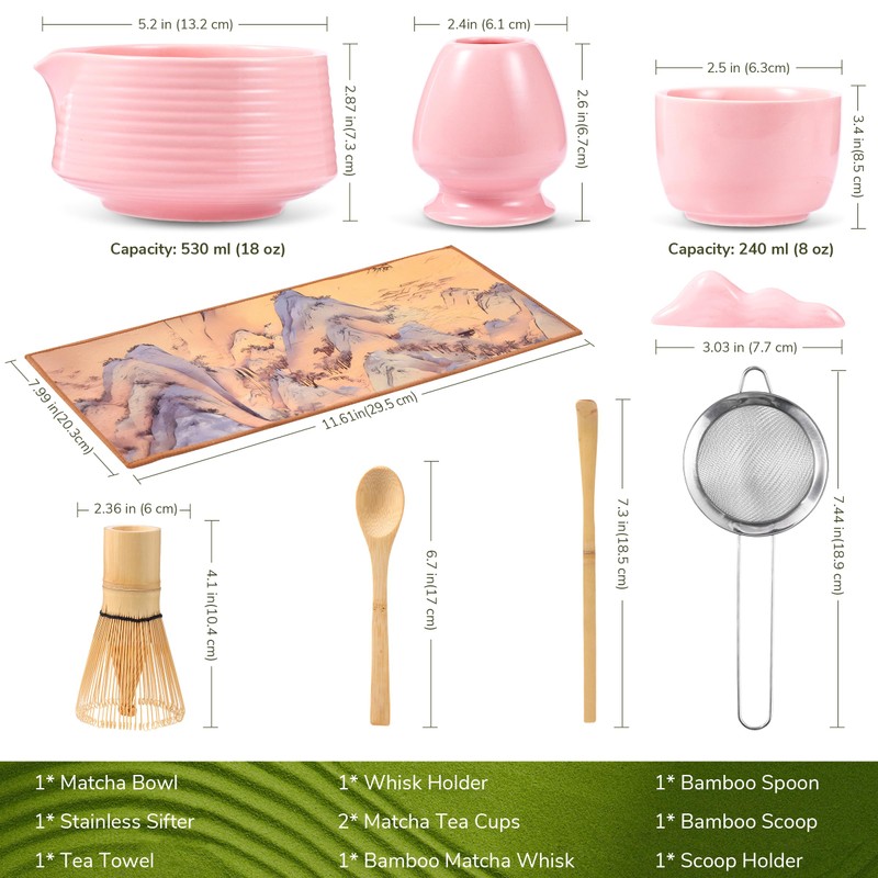 - 【All-in-One 10-Piece Matcha Kit】 Includes everything you need for an authentic Japanese tea ceremony: matcha bowl2 tea cupsbamboo whisk (chasen)whisk holderbamboo scoop (chashaku)spoonscoop restsifterand tea towel. Perfect for both beginners and matcha lovers