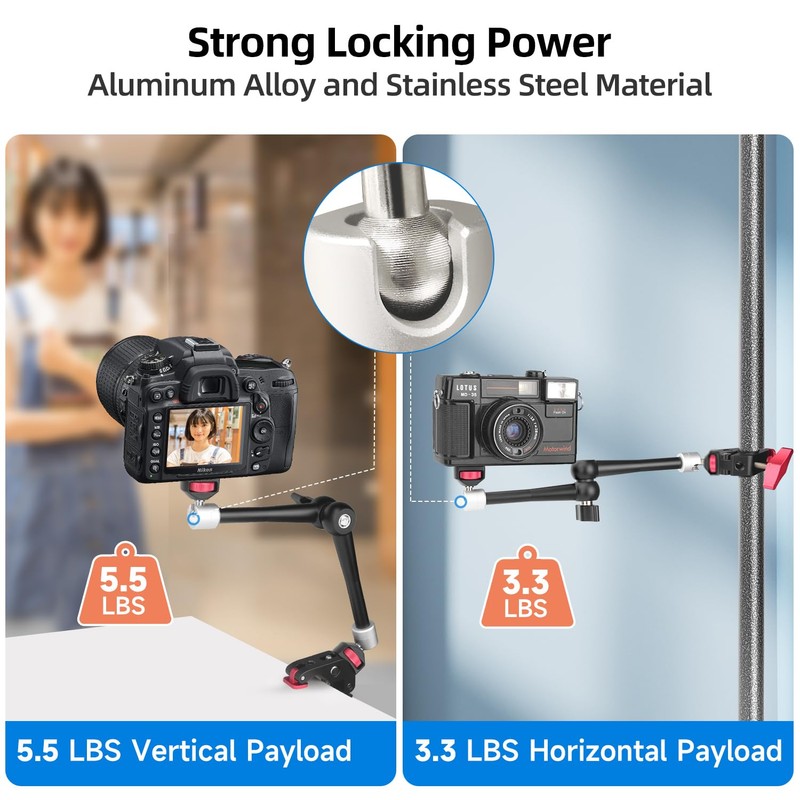 - Upgraded Anti-Twist Design for Secure Mounting: The 11 in magic arm features 1/4" screws at both ends with anti-twist retractable locating pins and nonslip pads for securely attaching accessories while in use and realize 360-degree free adjustment
