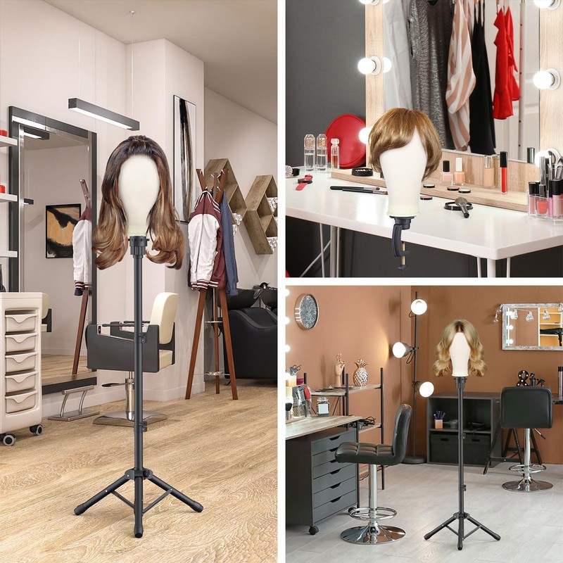 - Dual-purposeThe wig head stand Set includes a floor wig stand tripod and table clips, so you can make and display your wigs on tabletop or floor.
