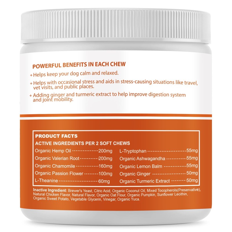 - Powerful 10-Ingredient Calming Blend: Our calming chews combine Hemp Oil, Valerian Root, Chamomile, Passion Flower, L-Theanine, L-Tryptophan, Ashwagandha, Lemon Balm, Ginger, and Turmeric Extract. This unique formula works synergistically to naturally reduce anxiety and stress, providing effective, holistic calming support.