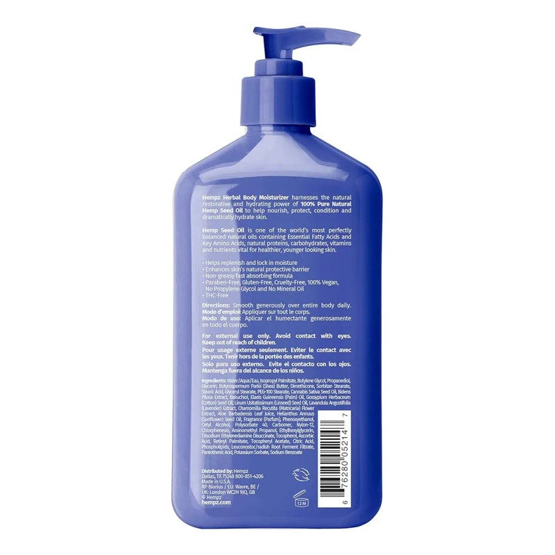 Hempz Body Lotion Lavender is a daily-use moisturizing cream made with 100% pure hemp seed oil, enriched with natural extracts and a relaxing lavender fragrance. This lotion nourishes the skin, leaving it soft, hydrated, and delicately scented.