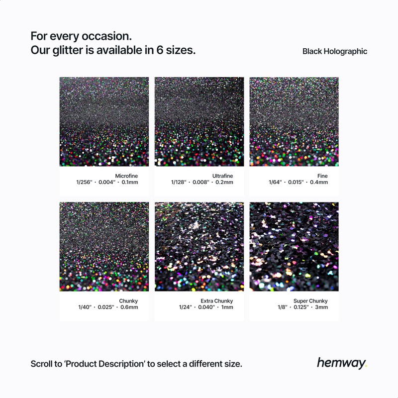 - Hemway Ultrafine glitter – Our multi-purpose black holographic craft resin glitter is perfect for epoxy resin cups, all silicone moulds, crystalline resin coasters and decorations. The cosmetic properties make this the ideal glitter for body, hair, face, eye and nail art. Create amazing glitter eyeshadow and make-up effects for festivals and parties.