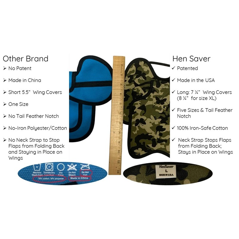 - Two superior styles. With three layers of protection Hen Saver chicken aprons for hens provide your beloved hens with protection from overzealous roosters! Our USA-made hen aprons are crafted from premium, 100% washable cotton canvas. Opt for the Single Strap chicken vest for a backpack-fit over both wings (chickens adore it!) or go for the Double Strap chicken jacket for hens with added neck loop for increased security (chickens may need a bit of time to get used to it). Your feathered friends will be clucking their thanks in no time!