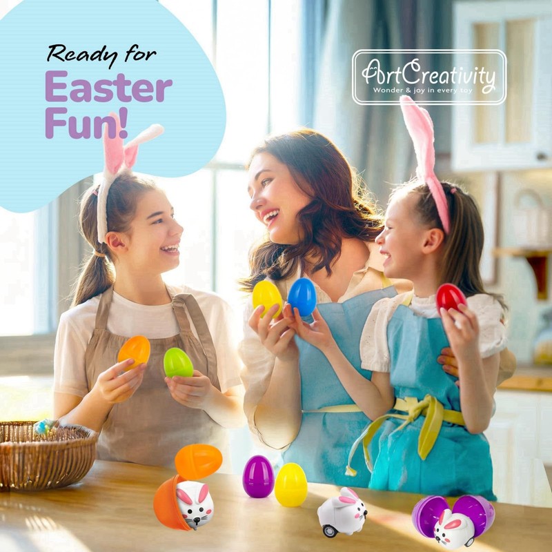 - Pack of 12 plastic Easter egg colours: our Easter egg set contains 12 Easter eggs with 12 rabbit car toys. Easter gifts children, Easter party favours, Easter eggs hunting, Easter egg hunt and much more