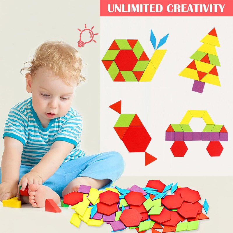 - Wooden pattern blocks are a fun and creative way for your children to explore shapes and symmetry. Create different shapes of animals, bugs, birds and things.