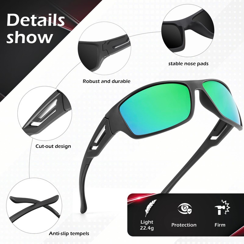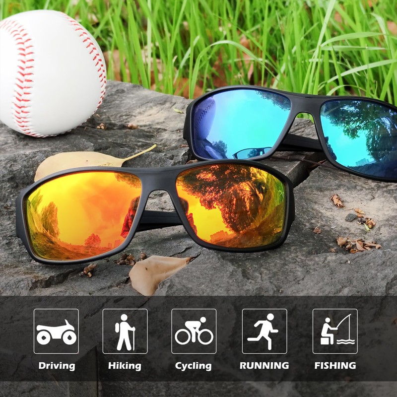 - Lightweight Frame ▶ Made with high-quality, lightweight materials, these men sunglasses offer superior eye protection and comfort during sports and leisure. With a focus on functionality and style, these polarized sunglasses for men are perfect for baseball, running, cycling, fishing, and other outdoor activities.