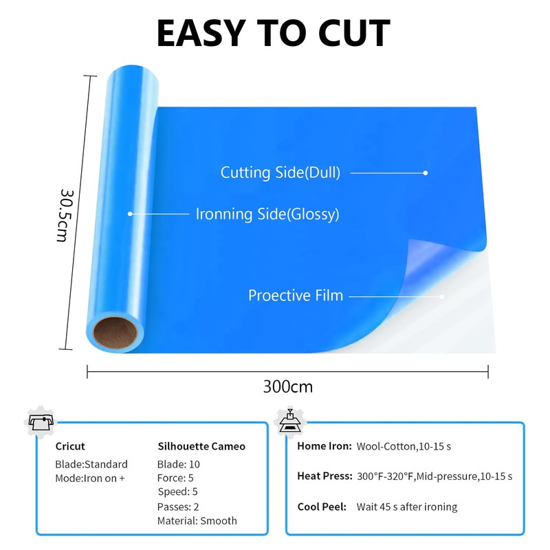 Hengrongshen Plotter Film Textile Blue, 30.5 cm x 300 cm Heat Transfer Vinyl Flex Film Rolls with Plotter Tool, Flex Film Plotter Textile for Cri-Cut & Silhouette DIY T-Shirt (Blue)