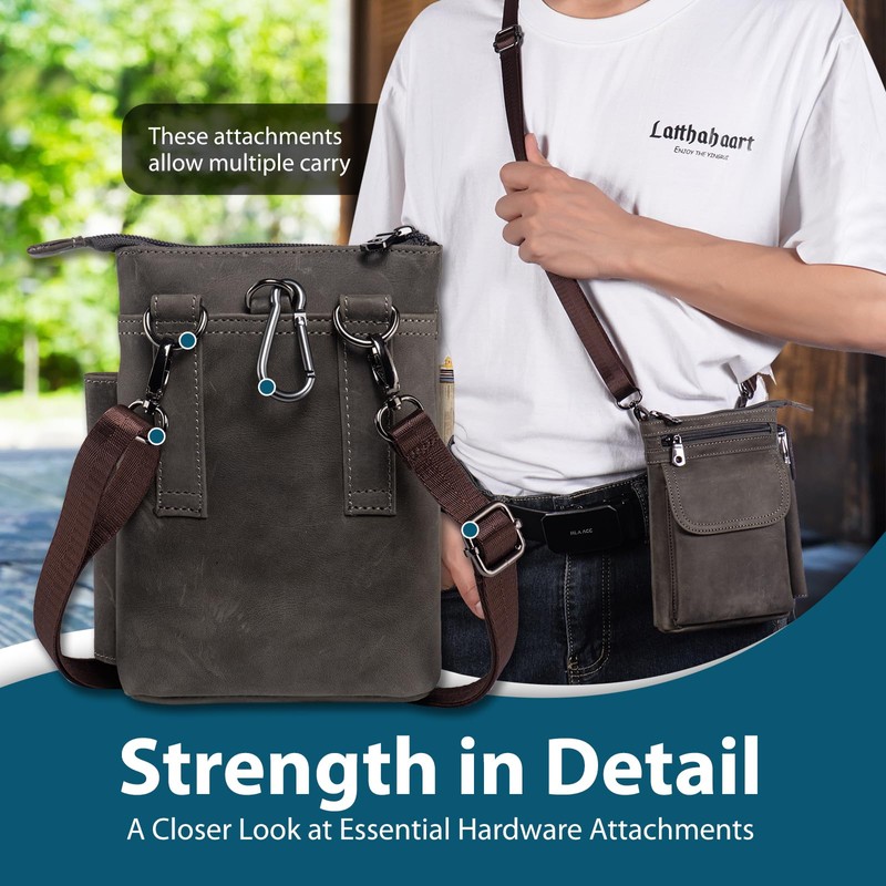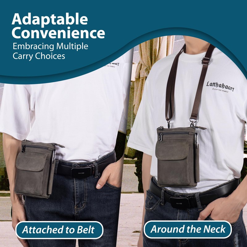 - VERSATILE WEAR: Adjust the nylon strap (up to 71 cm) for a comfortable crossbody style, or utilize the double leather belt loops (6 cm) for easy waist wear. You can attach it to belts or bags using the included carabiner, making it truly versatile.