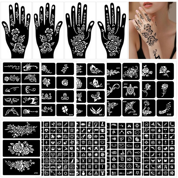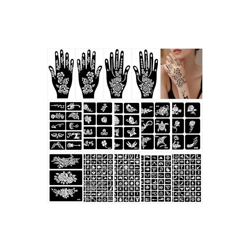 - Henna Schablonen Set :Enthaltene 4 Hand Schablonen, 243 StüCk Tattoo Schablonen (Nur Vorlagen, Keine Tattoo Tinte), Es Gibt Kleine Tattoo-Designs, MittelgroßE Tattoo-Designs Und GroßE Tattoo-Designs. Treffen Sie Ihre Verschiedenen MöGlichkeiten! TemporäRe Tattoo Schablonen FüR Tattoo-AnfäNger.