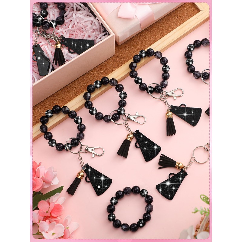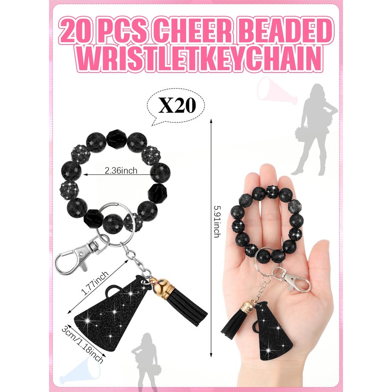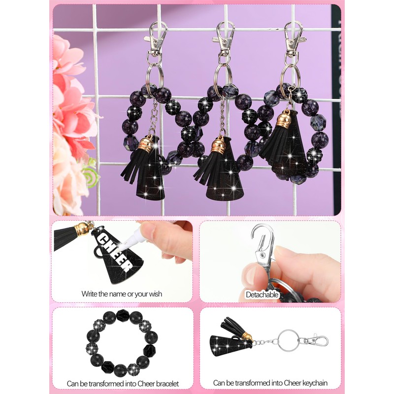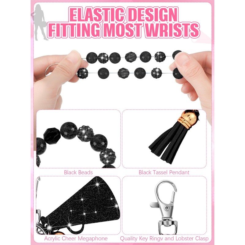 - Cheerleading Design: designed with the theme, our cheer wristlet keychains crafted with black beads, acrylic cheer megaphones, tassels and key ring are a representation of true cheer aesthetics; These keychains not only serve a practical purpose but also add a stylish touch to your look, seamlessly combining style and functionality for a delightful accessory you wouldn't want to miss