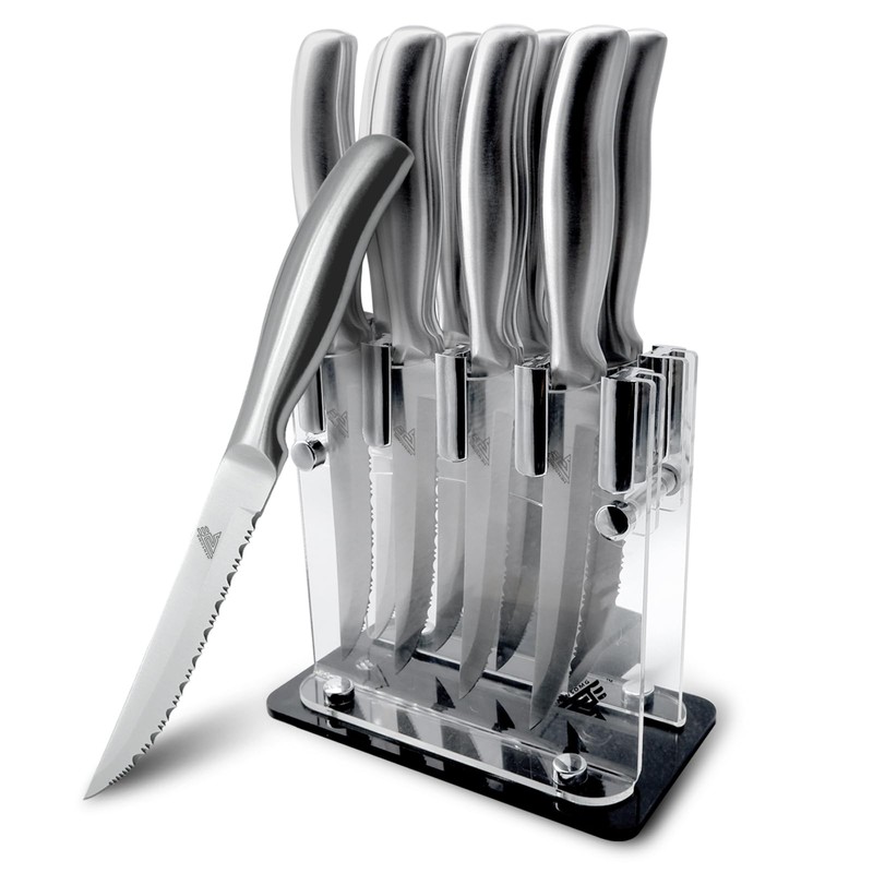 - HENSMG 9-piece steak knife set with an acrylic knife holder will make your cluttered kitchen became clean and tidy.It also makes your life so simple and happy.