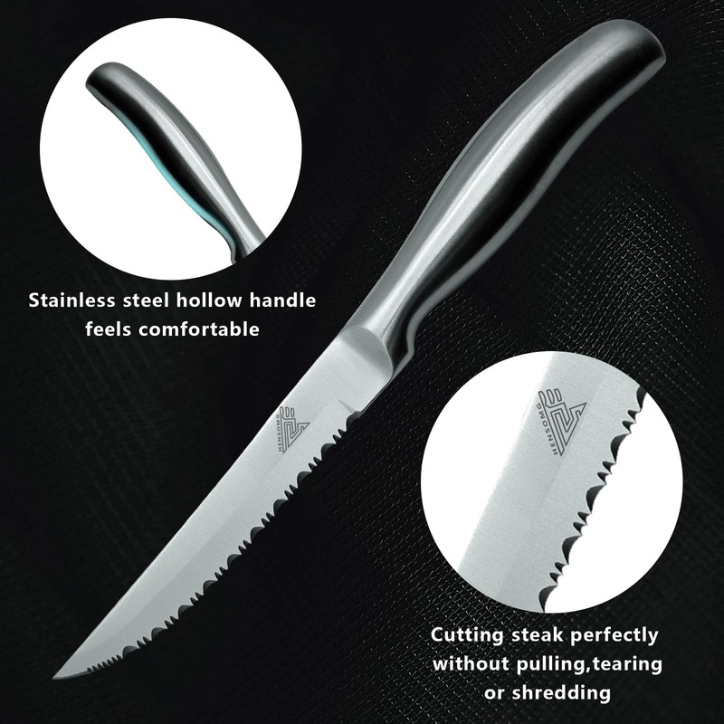 - HENSOMG 9-piece hollow handle steak knife set is composed of 8 steak knives and acrylic knife holder. Small and exquisite design,suitable for family dinners,restaurants and gifts.