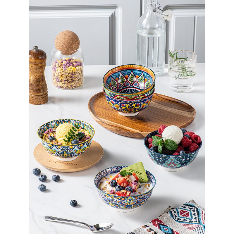 - 【Boho Beauty in Every Bite】Add a burst of color to your everyday dining with this colorful ceramic dessert bowls. Decorated with vibrant bohemian patterns inside and out, these 10 oz small bowls infuse charm and personality into any table setting—perfect for sweet treats, savory snacks, or stylish serving.