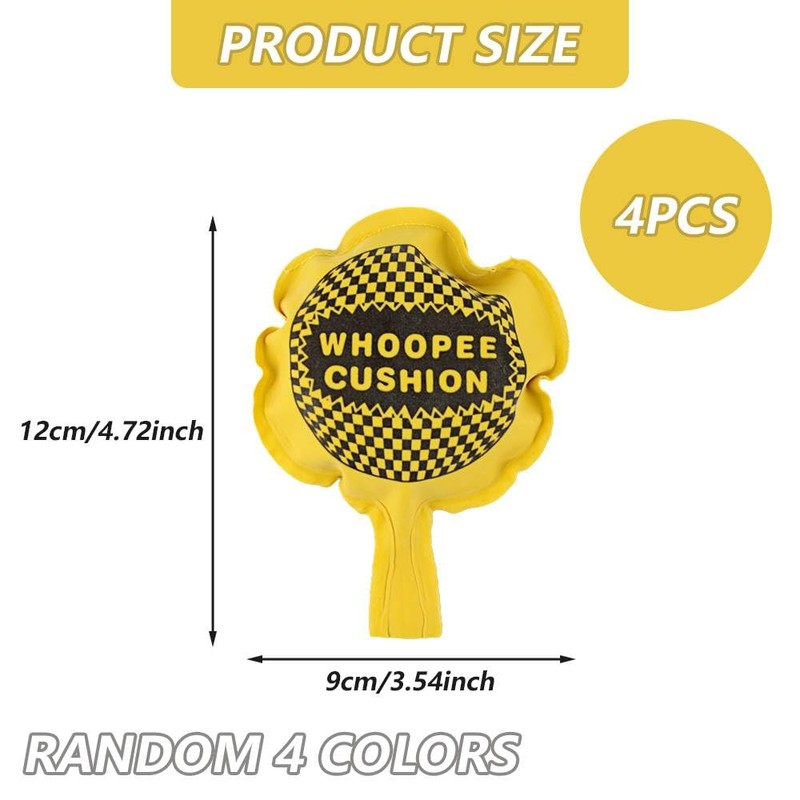 - đšăPackage Contentsă- The party bag fillers has four whoopee cushion, randomly colour packaged in 4 colours (red, yellow, blue, and green). Each package may contain duplicate colours. Each bag features vibrant colours, with dimensions approximately 12x9x3 cmïŒ4.72x3.54x1.18inchïŒ.
