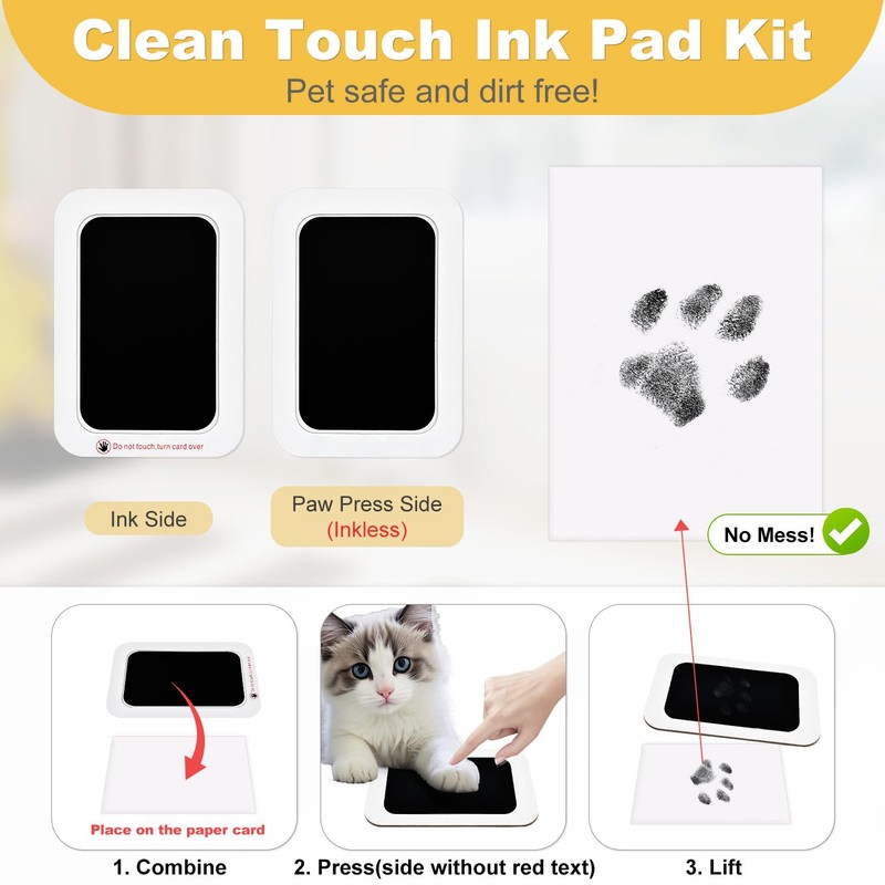 • Mess-Free & Clean Touch Paw Print: The paw print kit for dogs offers a no-mess, clean touch solution for capturing your pet's paw prints or nose prints without ink stains. Our dog paw print kit ensures safe contact with your dog's or cat's paws, leaving no residue unlike traditional paw print kit. Perfect for puppies, kittens, and even baby hand and footprints—simply press & lift for a crisp impression!(NOTE: Clean the paws and cut the hair short before use.)
