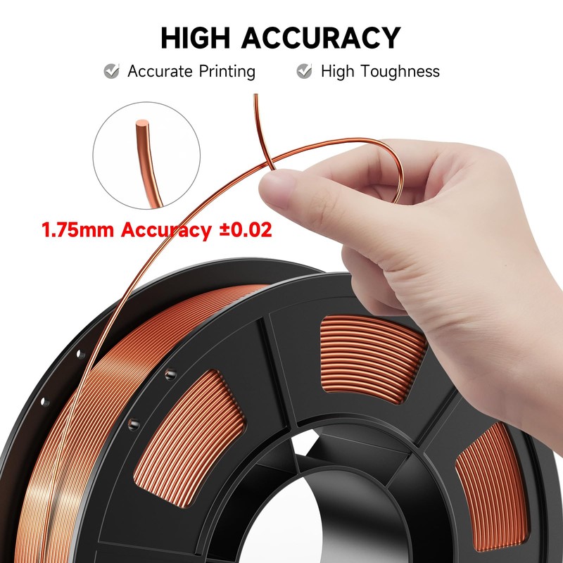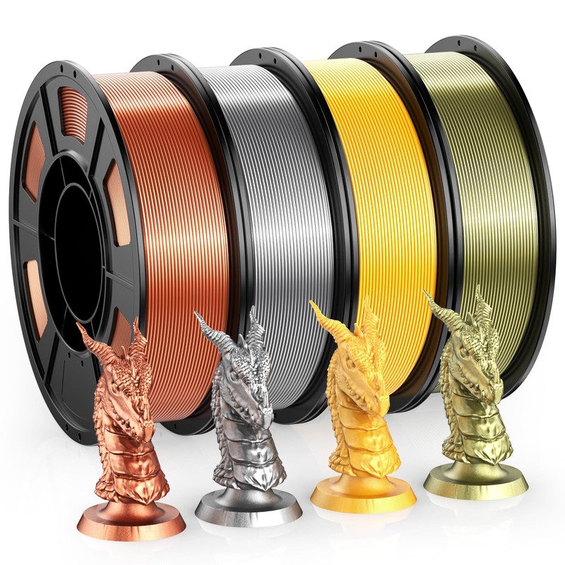 - 【Beautiful Silk PLA Filament】4 Colors Set Silk PLA filaments made with silk material, ensure easy feeding and printing quality. 4 color filaments include Pure Red Copper/Silver/Bronze/Gold, 200g per spool, a total 1KG. Print temperature 190°C-210°C.