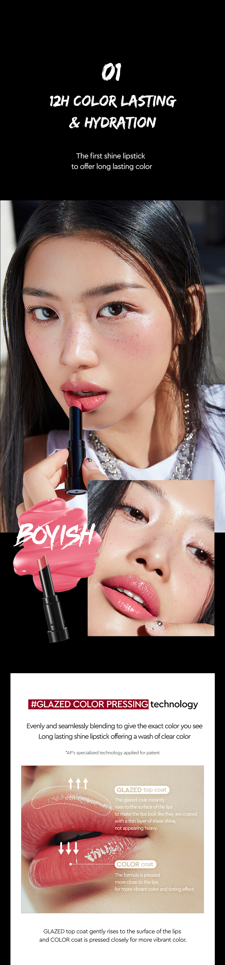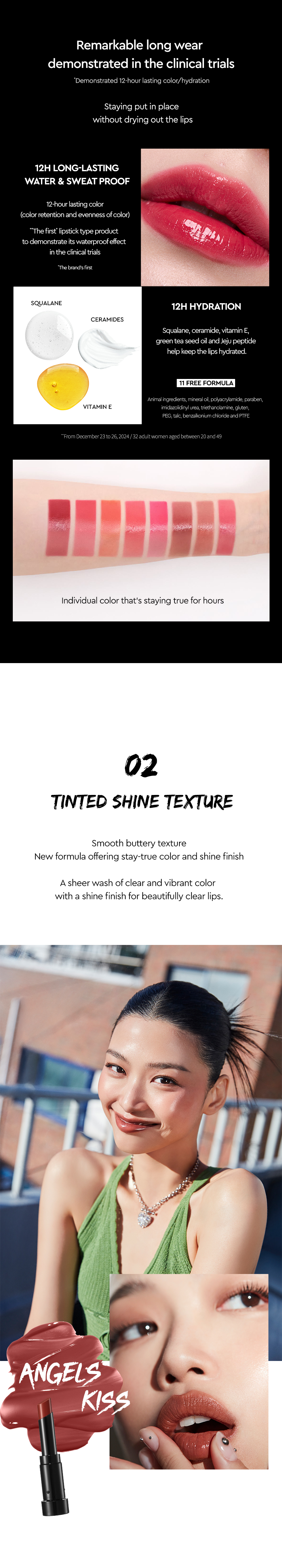 Utilized the patented long-lasting shine lip technology that allows even application while maintaining the product’s true color, this formula delivers a water-like gloss that lasts long without dryness. Clinically tested and certified as the first “waterproof” lipstick, it has been proven to maintain color & moisture for up to 12 hours. Experience a diverse spectrum of 8 vibrant, expressive shades designed to complement all styles without limits.