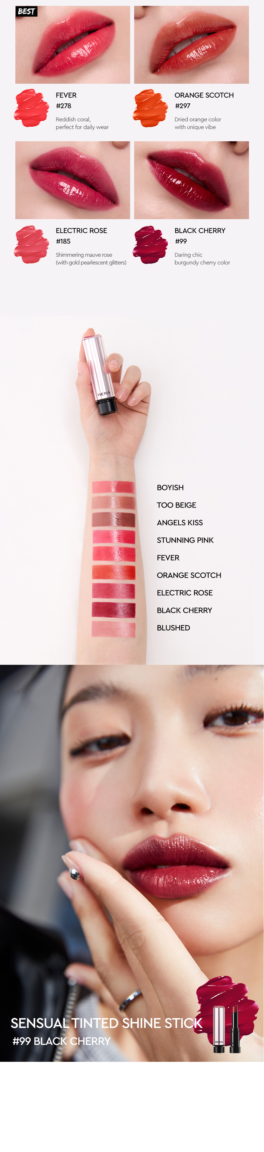 - Ingredients: [Boyish] Dipentaerythrityl Pentahydroxystearate/Pentaisostearate, Cetyl Ethylhexanoate, Diphenyl Dimethicone, Glyceryl Undecyl Dimethicone, Phytosteryl/Octyldodecyl Lauroyl Glutamate, Synthetic Wax, Octyldodecanol, Bis-Behenyl/Isostearyl/Phytosteryl Dimer Dilinoleyl Dimer Dilinoleate, Polyglyceryl-2 Triisostearate, Titanium Dioxide (CI 77891), Lauryl Polyglyceryl-3 Polydimethylsiloxyethyl Dimethicone, Iron Oxide Red, Lithol Rubine BCA, Polyhydroxystearic Acid, Ethylene/Propylene Copolymer, Lecithin, Sunset Yellow FCF, Ethylhexyl Palmitate, Isostearic Acid, Isopropyl Myristate, Dimethicone, Aluminum Hydroxide, Polyglyceryl-3 Polyricinoleate, Triethoxycaprylylsilane, Iron Oxide Black, Benzyl Benzoate, Fragrance, Squalane, Tocopheryl Acetate, Camellia Sinensis Seed Oil, Tocopherol, Glycerin, Glycine Max (Soybean) Polypeptide, Linalool, Hydroxycitronellal, Glycine Max (Soybean) Oil, Ceramide NP, Phytosphingosine, Hydrogenated Lecithin, Canola Oil, Rosmarinus Officinalis (Rosemary) Leaf Extract [Too Beige] Dipentaerythrityl Pentahydroxystearate/Pentaisostearate, Cetyl Ethylhexanoate, Diphenyl Dimethicone, Glyceryl Undecyl Dimethicone, Phytosteryl/Octyldodecyl Lauroyl Glutamate, Synthetic Wax, Octyldodecanol, Bis-Behenyl/Isostearyl/Phytosteryl Dimer Dilinoleyl Dimer Dilinoleate, Polyglyceryl-2 Triisostearate, Titanium Dioxide (CI 77891), Lauryl Polyglyceryl-3 Polydimethylsiloxyethyl Dimethicone, Iron Oxide Red, Lithol Rubine BCA, Polyhydroxystearic Acid, Ethylene/Propylene Copolymer, Lecithin, Sunset Yellow FCF, Ethylhexyl Palmitate, Isostearic Acid, Isopropyl Myristate, Dimethicone, Aluminum Hydroxide, Polyglyceryl-3 Polyricinoleate, Triethoxycaprylylsilane, Iron Oxide Black, Benzyl Benzoate, Fragrance, Squalane, Tocopheryl Acetate, Camellia Sinensis Seed Oil, Tocopherol, Glycerin, Glycine Max (Soybean) Polypeptide, Linalool, Hydroxycitronellal, Glycine Max (Soybean) Oil, Ceramide NP, Phytosphingosine, Hydrogenated Lecithin, Canola Oil, Rosmarinus Officinalis (Rosemary) Leaf Extract [Angel’s Kiss] Dipentaerythrityl Pentahydroxystearate/Pentaisostearate, Cetyl Ethylhexanoate, Diphenyl Dimethicone, Glyceryl Undecyl Dimethicone, Phytosteryl/Octyldodecyl Lauroyl Glutamate, Synthetic Wax, Octyldodecanol, Bis-Behenyl/Isostearyl/Phytosteryl Dimer Dilinoleyl Dimer Dilinoleate, Polyglyceryl-2 Triisostearate, Titanium Dioxide (CI 77891), Lauryl Polyglyceryl-3 Polydimethylsiloxyethyl Dimethicone, Iron Oxide Red, Lithol Rubine BCA, Polyhydroxystearic Acid, Ethylene/Propylene Copolymer, Lecithin, Sunset Yellow FCF, Ethylhexyl Palmitate, Isostearic Acid, Isopropyl Myristate, Dimethicone, Aluminum Hydroxide, Polyglyceryl-3 Polyricinoleate, Triethoxycaprylylsilane, Iron Oxide Black, Benzyl Benzoate, Fragrance, Squalane, Tocopheryl Acetate, Camellia Sinensis Seed Oil, Tocopherol, Glycerin, Glycine Max (Soybean) Polypeptide, Linalool, Hydroxycitronellal, Glycine Max (Soybean) Oil, Ceramide NP, Phytosphingosine, Hydrogenated Lecithin, Canola Oil, Rosmarinus Officinalis (Rosemary) Leaf Extract [Stunning Pink] Dipentaerythrityl Pentahydroxystearate/Pentaisostearate, Cetyl Ethylhexanoate, Phytosteryl/Octyldodecyl Lauroyl Glutamate, Diphenyl Dimethicone, Glyceryl Undecyl Dimethicone, Synthetic Wax, Bis-Behenyl/Isostearyl/Phytosteryl Dimer Dilinoleyl Dimer Dilinoleate, Polyglyceryl-2 Triisostearate, Lauryl Polyglyceryl-3 Polydimethylsiloxyethyl Dimethicone, Titanium Dioxide (CI 77891), Lithol Rubine BCA, Polyhydroxystearic Acid, Ethylene/Propylene Copolymer, Bismuth Oxychloride, Phloxine B, Lecithin, Iron Oxide Red, Ethylhexyl Hydroxystearate, Ethylhexyl Palmitate, Isostearic Acid, Isopropyl Myristate, Polyglyceryl-3 Polyricinoleate, Dimethicone, Aluminum Hydroxide, Benzyl Benzoate, Triethoxycaprylylsilane, Fragrance, Tocopherol, Squalane, Tocopheryl Acetate, Camellia Sinensis Seed Oil, Glycerin, Glycine Max (Soybean) Polypeptide, Linalool, Hydroxycitronellal, Glycine Max (Soybean) Oil, Iron Oxide Black, Ceramide NP, Phytosphingosine, Hydrogenated Lecithin, Canola Oil, Rosmarinus Officinalis (Rosemary) Leaf Extract [Fever] Dipentaerythrityl Pentahydroxystearate/Pentaisostearate, Cetyl Ethylhexanoate, Diphenyl Dimethicone, Glyceryl Undecyl Dimethicone, Phytosteryl/Octyldodecyl Lauroyl Glutamate, Synthetic Wax, Bis-Behenyl/Isostearyl/Phytosteryl Dimer Dilinoleyl Dimer Dilinoleate, Polyglyceryl-2 Triisostearate, Lauryl Polyglyceryl-3 Polydimethylsiloxyethyl Dimethicone, Titanium Dioxide (CI 77891), Tartrazine, Lithol Rubine BCA, Polyhydroxystearic Acid, Ethylene/Propylene Copolymer, Iron Oxide Red, Lecithin, Eosine YS, Ethylhexyl Palmitate, Isostearic Acid, Isopropyl Myristate, Polyglyceryl-3 Polyricinoleate, Dimethicone, Benzyl Benzoate, Fragrance, Squalane, Tocopheryl Acetate, Camellia Sinensis Seed Oil, Tocopherol, Glycerin, Glycine Max (Soybean) Polypeptide, Linalool, Hydroxycitronellal, Glycine Max (Soybean) Oil, Ceramide NP, Phytosphingosine, Hydrogenated Lecithin, Canola Oil, Rosmarinus Officinalis (Rosemary) Leaf Extract [Orange Scotch] Dipentaerythrityl Pentahydroxystearate/Pentaisostearate, Cetyl Ethylhexanoate, Diphenyl Dimethicone, Glyceryl Undecyl Dimethicone, Phytosteryl/Octyldodecyl Lauroyl Glutamate, Synthetic Wax, Bis-Behenyl/Isostearyl/Phytosteryl Dimer Dilinoleyl Dimer Dilinoleate, Polyglyceryl-2 Triisostearate, Lauryl Polyglyceryl-3 Polydimethylsiloxyethyl Dimethicone, Iron Oxide Red, Titanium Dioxide (CI 77891), Sunset Yellow FCF, Lithol Rubine B, Polyhydroxystearic Acid, Ethylene/Propylene Copolymer, Bismuth Oxychloride, Lithol Rubine BCA, Lecithin, Ethylhexyl Hydroxystearate, Ethylhexyl Palmitate, Isostearic Acid, Isopropyl Myristate, Polyglyceryl-3 Polyricinoleate, Dimethicone, Benzyl Benzoate, Iron Oxide Black, Fragrance, Squalane, Tocopheryl Acetate, Camellia Sinensis Seed Oil, Tocopherol, Glycerin, Glycine Max (Soybean) Polypeptide, Linalool, Hydroxycitronellal, Glycine Max (Soybean) Oil, Ceramide NP, Phytosphingosine, Hydrogenated Lecithin, Canola Oil, Rosmarinus Officinalis