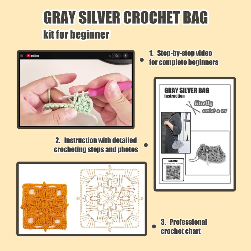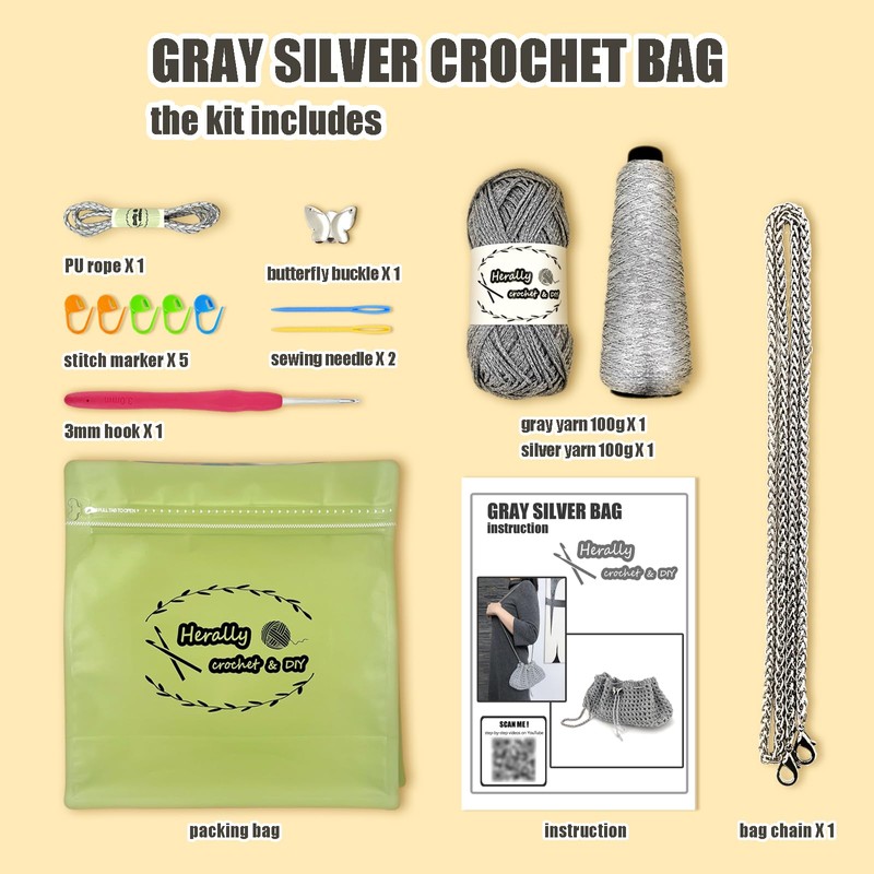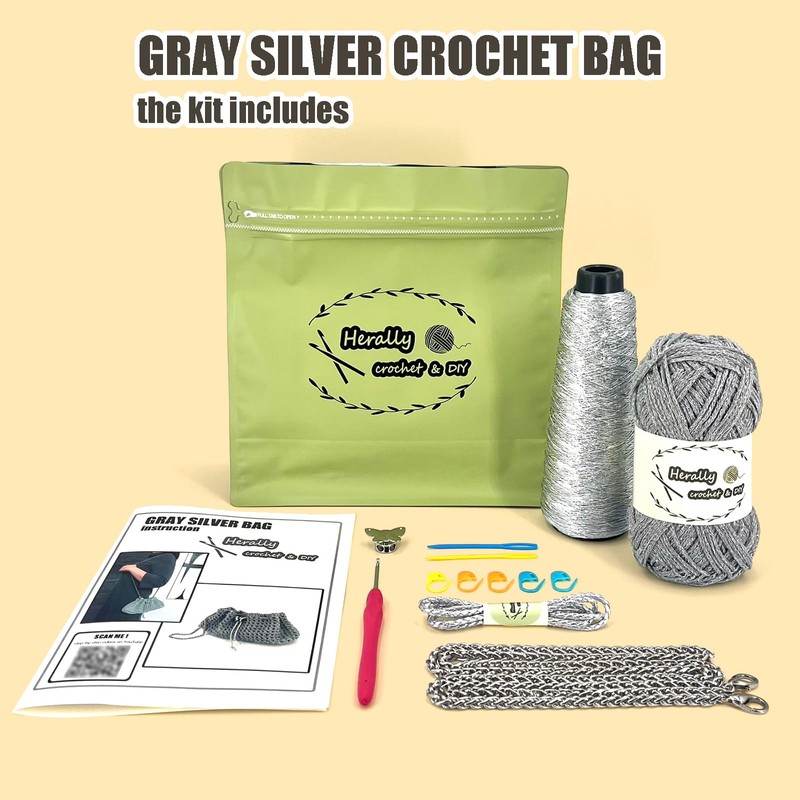 Herally Crochet Kit DIY Bag for Beginners - Include Yarn, Hook and Accessory - with Step by Step Video Tutorials - Crochet Crossbody Bag (Gray)