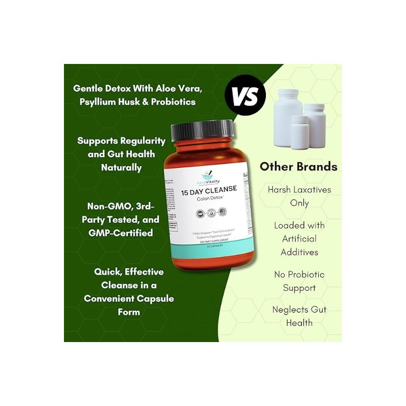Herb Vitality’s 15-Day Colon Cleanse Support your digestive health with our 15-Day Colon Cleanse. This blend features a mix of herbal ingredients, including psyllium husk, aloe vera, licorice root, and flaxseed, designed to promote a balanced digestive system. Enriched with Lactobacillus Acidophilus and probiotics, this formula helps maintain gut flora balance and support overall wellness. It is ideal for daily use to help you feel your best.