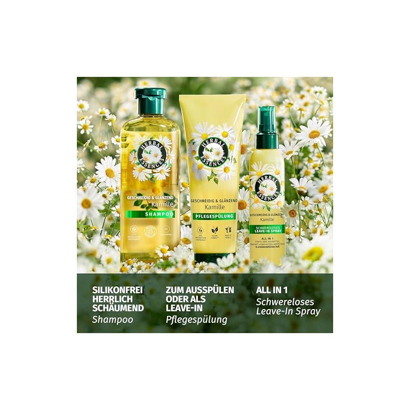 Strahle mit der geheimen Kraft der Natur für einen lebendigen Glanz – mit dem Herbal Essences Schwereloses All In 1 Leave-In Spray mit Kamille. Angereichert mit Kamillenextrakt, verstärkt dieser Conditioner den natürlichen Glanz und die Geschmeidigkeit deines Haars, ohne es zu beschweren. Verwende es auch als Haarparfüm, um den langanhaltenden Duft einer Sommerwiese zu genießen und dich von den blumigen Noten umhüllen zu lassen. Unsere All-in-One-Formel, reich an pflanzlichen Nährstoffen, macht dein Haar unwiderstehlich weich und strahlend. Dieses vielseitige Produkt entwirrt, pflegt, reduziert Frizz, repariert*, schützt vor Hitze und verleiht deinem Haar einen gesunden Glanz. Es hinterlässt dein Haar geschmeidig und einfach zu stylen. Angereichert mit essenziellen Nährstoffen revitalisiert es dein Haar, sodass es gesünder und glänzender aussieht. Wir wählen sorgfältig Inhaltsstoffe natürlichen Ursprungs* aus, um die wunderbare Kraft der Natur in dein Badezimmer zu bringen. Stelle die natürliche Schönheit deines Haares wieder her und belebe deine Sinne mit den unwiderstehlichen Duft der Sommerwiese mit unserer Kamillenkollektion. *repariert bis zur Geschmeidigkei **bezieht sich auf die Inhaltsstoffe der Formel