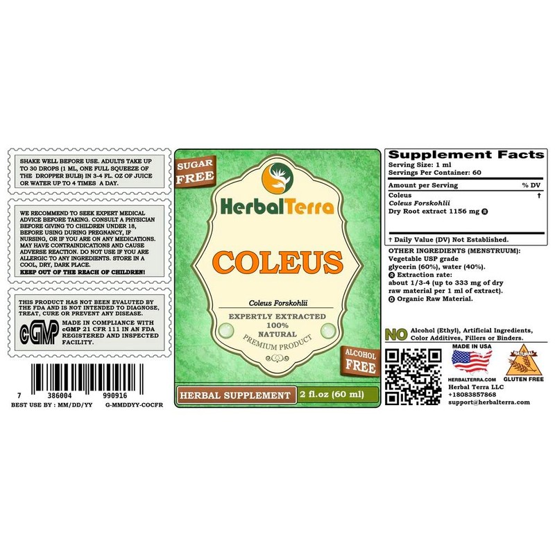 - We made this Coleus liquid extract using ONLY natural ingredients! This extract does not contain Alcohol, GMO, gluten, artificial colors, heavy metals, preservatives, pesticides or fertilizers!