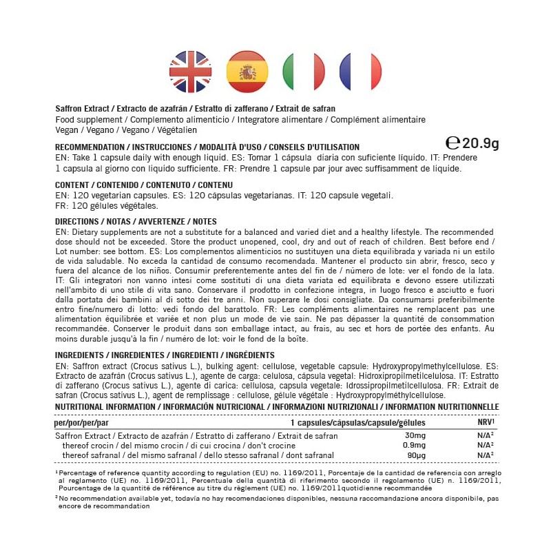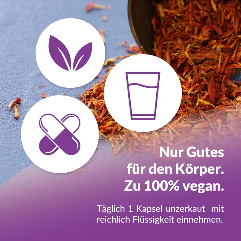 - Safe intake: these are vegetable saffron capsules that are manufactured in compliance with the highest laboratory standards and hygiene guidelines. The vegan capsules contain no additives.