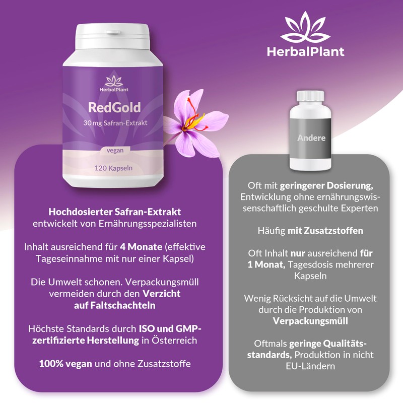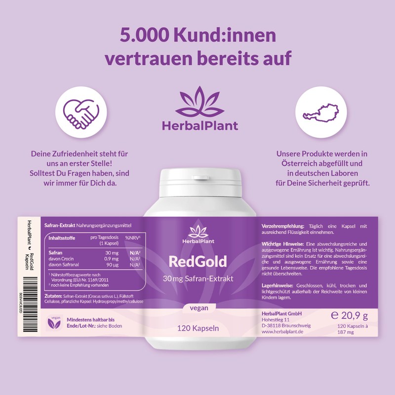 HerbalPlant RedGold Saffron Extract Capsules - Natural Mood Brightener High Dose - Vegetable Crocin & Saffron - 100% Vegan - Laboratory Tested - 120 Saffron Capsules in Supply for 4 Months