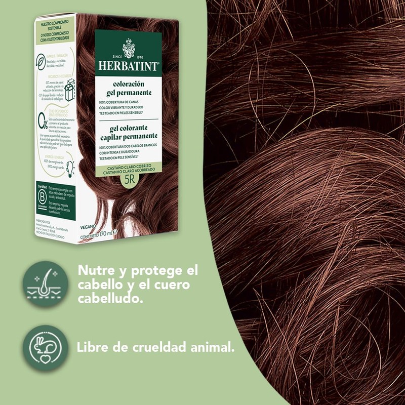HERBATINT, Coloración Permanente para Cabello en Gel - color CASTAÑO CLARO COBRIZO 5R - 170 ml - Sin Amoníaco - 100% Cobertura de Canas - para Pieles Sensibles - con 8 Extractos Naturales BIO