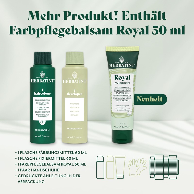 - NEW FORMAT 170 ml: Same formula - New packaging - More product! The Herbatint permanent hair dye gel (170 ml) retains its exclusive formula unchanged and offers more compact packaging made from recycled and recyclable materials. In addition, it now contains 50 ml of balm royal conditioner.
