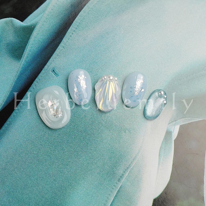 Herbeluemily Nail Tip, Short, Handmade, 3D Storage Case, 10 Pieces, Flower, Mermaid, Oval Blue, L
