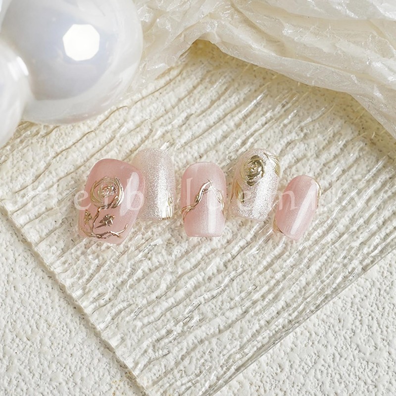 - Pink x Rose Nails: Pink and pearl white with elegant line rose. Subtle gold lines are not overstated, but add glamour to your fingertips. In addition, the mirror nail style design makes it easy to incorporate trends