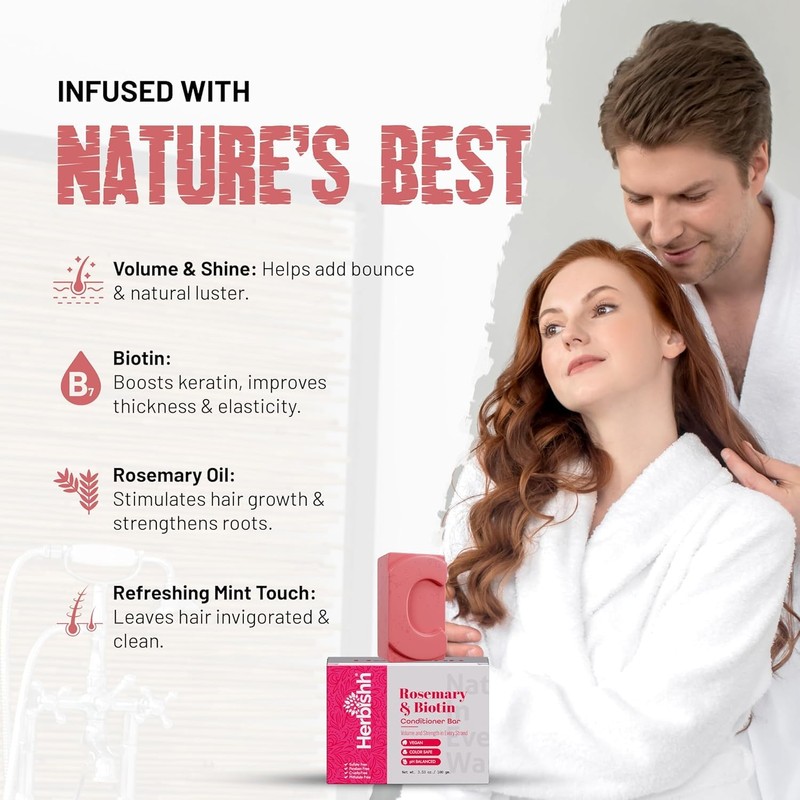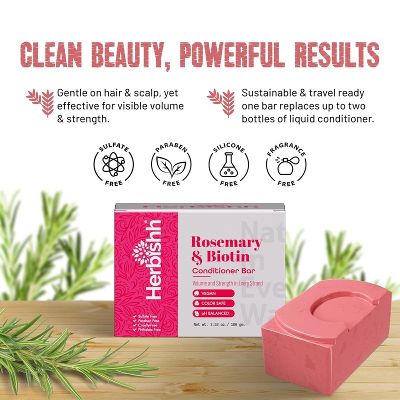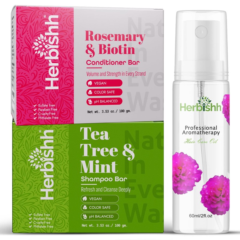 Herbishh Herbal Clarifying & Nourishing Set – Tea Tree Shampoo Bar + Rosemary Conditioner Bar + Essential Flower Hair Oil 60ml – For Itchy Scalp, Thin Hair & Shine – Sulfate-Free, Vegan