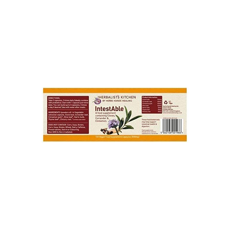 Product descriptionIntestAble Capsules can help support general intestinal health and digestion. In fact, their antimicrobial capabilities and especially the Cloves, Coriander and Garlic have been used for thousands of years. Whilst the Olive leaves have long been used as a fast-acting immune defender in countries where it grows prolifically. The formula can also be helpful for those recovering from a diet previously rich in sugary and yeasty foods or those with 'yeast' overload. These capsules can also be useful during and after holidays abroad, to help overcome the possible effects of less hygienic food circumstances (or indeed, those experienced at home).IndicationsDOES NOT CONTAIN: Corn, Soya, Gluten, Wheat, Dairy, Caffeine, Preservatives, Starch or Colouring. Non GMO & Non Irradiated. Suitable for vegetarian and vegan.IngredientsIngredients: Clove bud, Coriander leaf, Wild Cinnamon quill, Wild Olive leaf, Garlic bulb, Wild Thyme leaf, and Wild Chicory root in vegetable cellulose capsules. - 150 capsules (550mg)DirectionsTake 2 capsules, 3 times daily (ideally combine with probiotics). Start with 1 capsule just twice daily. You can build up to 3 capsules, 3 times a day if desired. Take with water after meals.Safety WarningDo not use during pregnancy and breastfeeding.Manufacturer Contact InformationHerbs Hands Healing ltd. Station Road Pulham Market Norfolk IP21 4XF - UK (+44) 01379608201