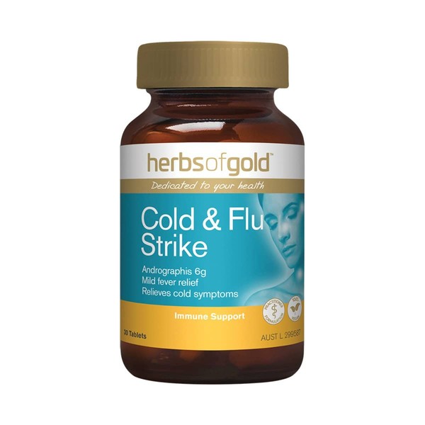 Herbs of Gold Cold & Flu Strike is a comprehensive blend of herbs and nutrients, including high-strength Andrographis to relieve symptoms of common colds and flu. It contains herbs including Echinacea, plus vitamin C and zinc to support immune system health. It also includes Elderberry, traditionally used in Western herbal medicine to relieve symptoms of common colds and flu, including mild fever.
